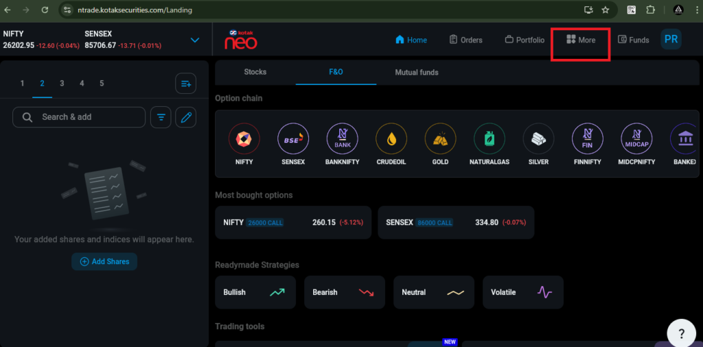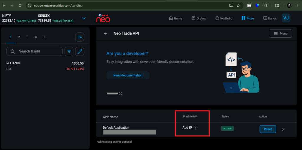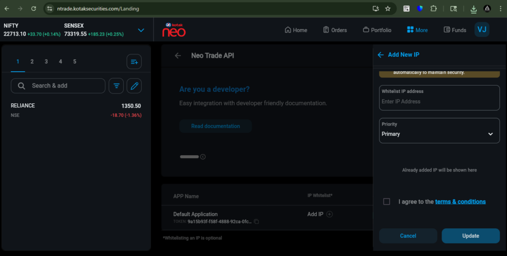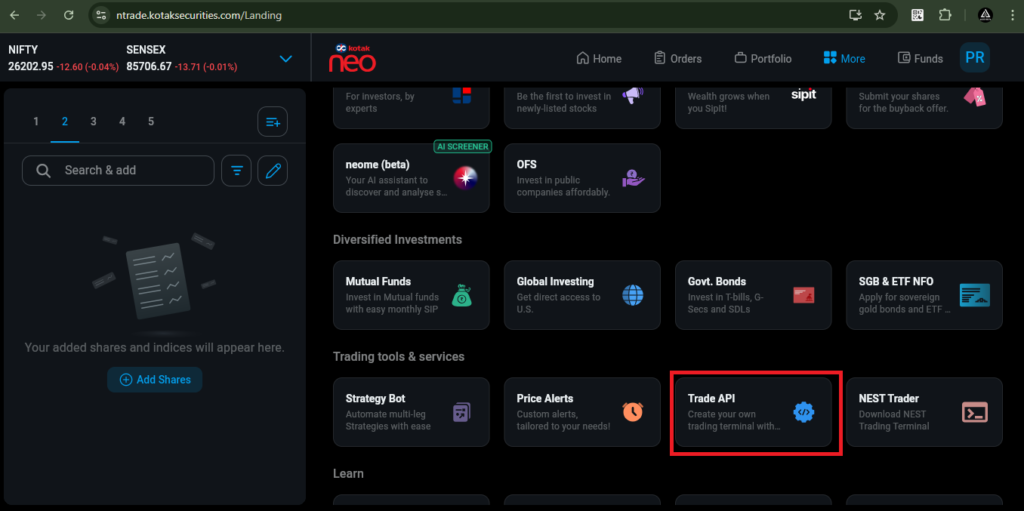 To add a Static IP in Kotak Broker, click on the ‘More’ tab, then select ‘Trade API.