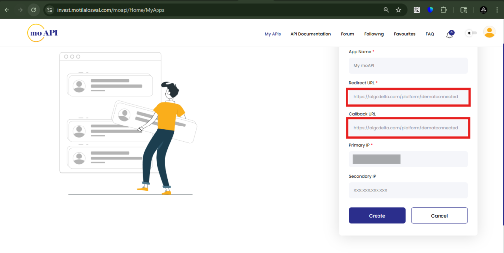 - You will be redirected to a new page. From there, click on the ‘Create an API Key’ button. Enter the ‘App Name’ (e.g., ‘AlgoDelta’) and set both the ‘Redirect URL’ and ‘Callback URL’ to https://algodelta.com/platform/dematconnected.