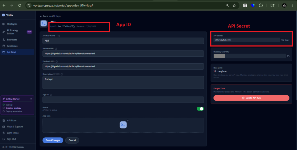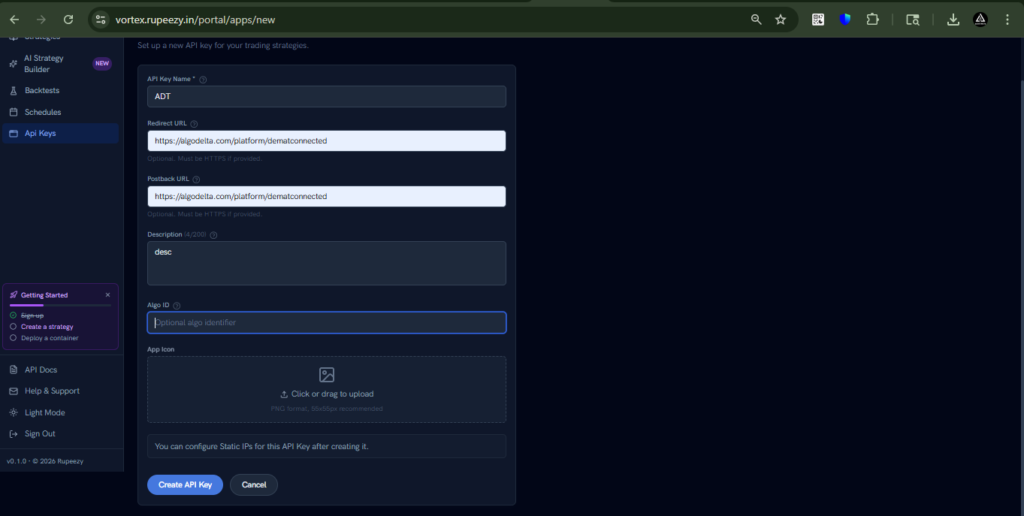 Then, enter the ‘API Key Name.’ In the Redirect URL and Postback URL fields, enter https://algodelta.com/platform/dematconnected. Add any description as required, and then click on the ‘Create API Key’ button.