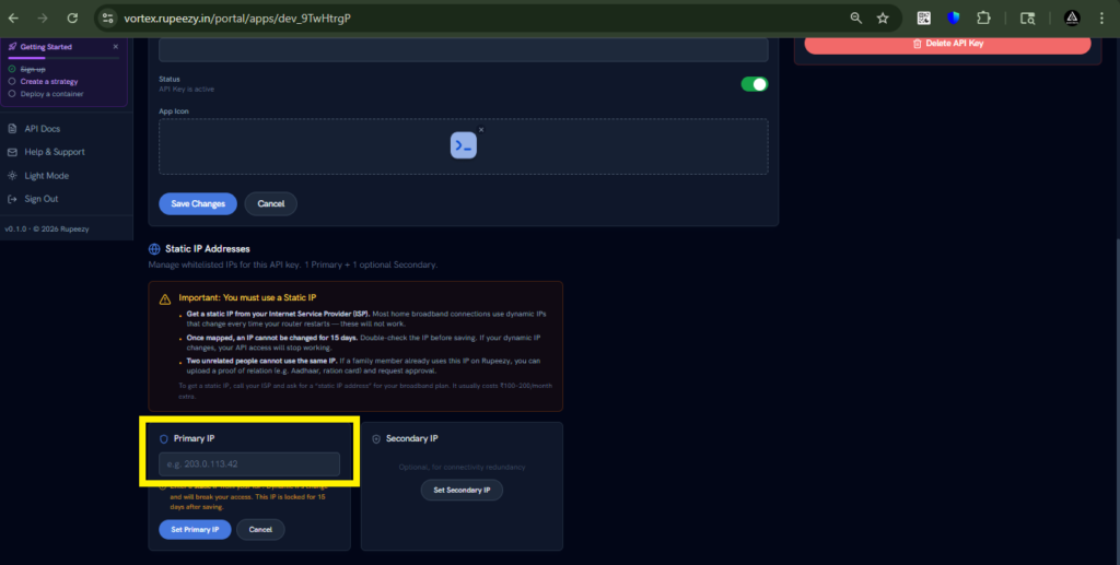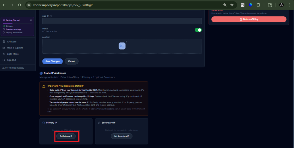 Now, scroll down to find the ‘Primary IP’ option. Click on ‘Set Primary IP’ and enter the Static IP obtained from AlgoDelta.