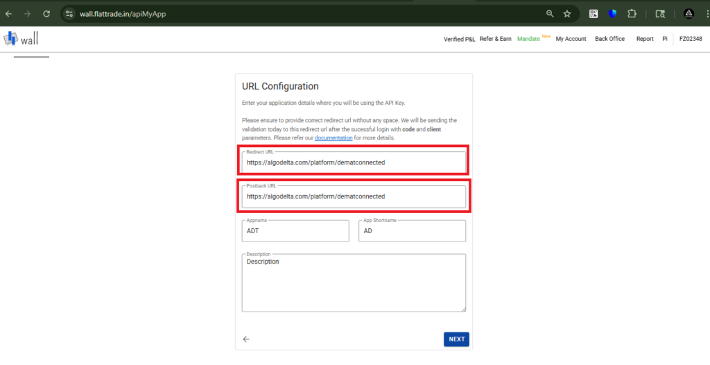 2 . On the next page, enter https://algodelta.com/platform/dematconnected in both the Redirect URL and Postback URL fields. Set the App Name (e.g., ‘ADT’) and App Short Name (e.g., ‘AD’)—you can choose any name. You can also enter any description, Then, click on the ‘Next’ button.