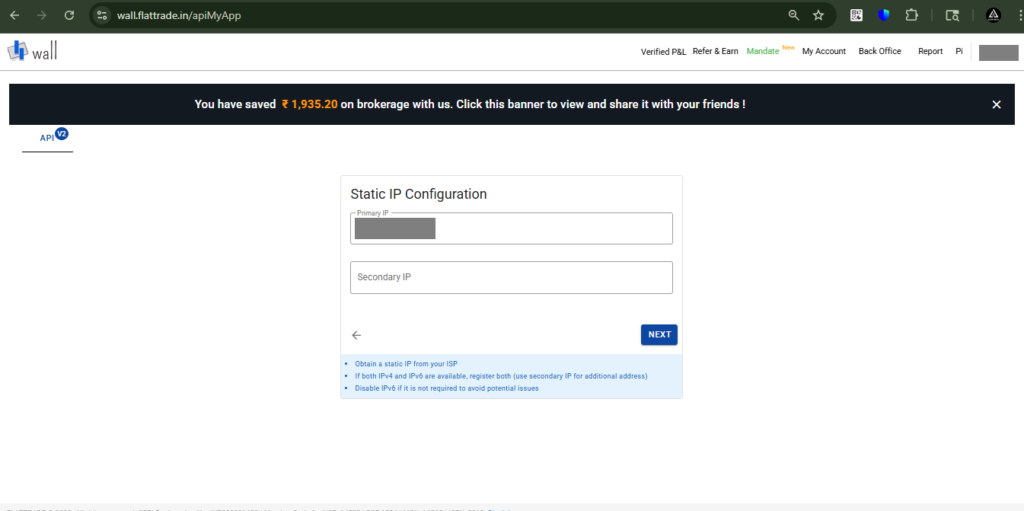 1 . Then, enter the Static IP obtained from AlgoDelta and click on the ‘Next’ button.