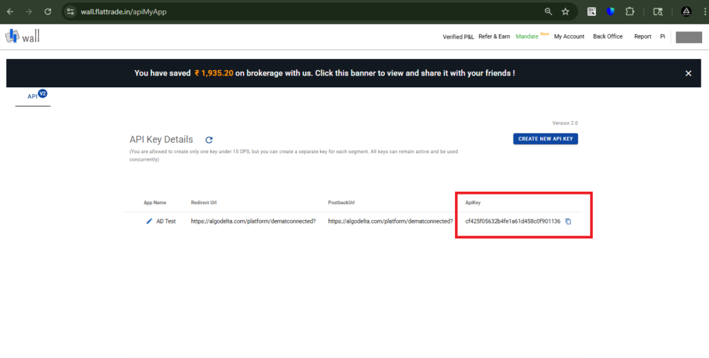 1. Generate the API Key from the Flattrade Portal.